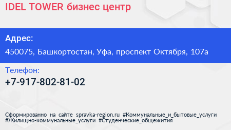 IDEL TOWER, бизнес-центр по адресу 450075, Башкортостан, Уфа, проспект Октября, 107а в дальнейшем Организация, размещена в следующих категориях:
