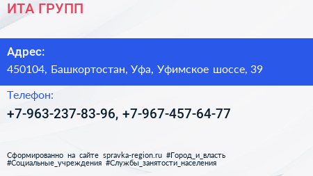 ИТА ГРУПП по адресу 450104, Башкортостан, Уфа, Уфимское шоссе, 39 в дальнейшем Организация, размещена в следующих категориях:
