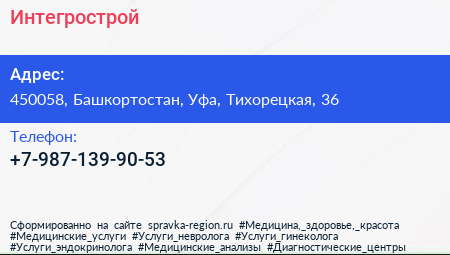 Интегрострой по адресу 450058, Башкортостан, Уфа, Тихорецкая, 36 в дальнейшем Организация, размещена в следующих категориях: