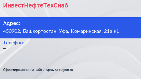 ИнвестНефтеТехСнаб по адресу 450902, Башкортостан, Уфа, Комаринская, 21а к1 в дальнейшем Организация, размещена в следующих категориях: