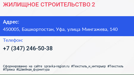 ЖИЛИЩНОЕ СТРОИТЕЛЬСТВО №2 по адресу 450005, Башкортостан, Уфа, улица Мингажева, 140 в дальнейшем Организация, размещена в следующих категориях: