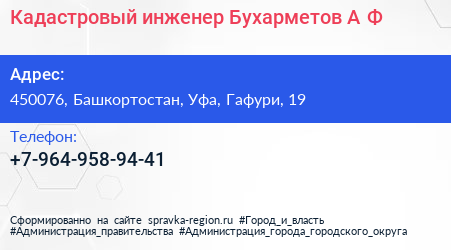 Кадастровый инженер Бухарметов А.Ф. по адресу 450076, Башкортостан, Уфа, Гафури, 19 в дальнейшем Организация, размещена в следующих категориях: