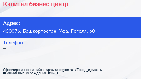 Капитал, бизнес-центр по адресу 450076, Башкортостан, Уфа, Гоголя, 60 в дальнейшем Организация, размещена в следующих категориях: