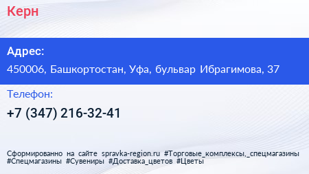 Керн по адресу 450006, Башкортостан, Уфа, бульвар Ибрагимова, 37 в дальнейшем Организация, размещена в следующих категориях: