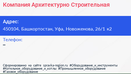Компания Архитектурно-Строительная по адресу 450104, Башкортостан, Уфа, Новоженова, 26/1 к2 в дальнейшем Организация, размещена в следующих категориях: