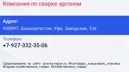 Компания по сварке аргоном по адресу 450097, Башкортостан, Уфа, Заводская, 11в в дальнейшем Организация, размещена в следующих категориях: