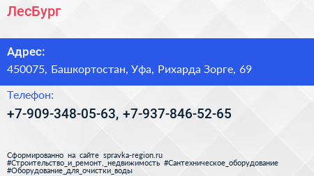 ЛесБург по адресу 450075, Башкортостан, Уфа, Рихарда Зорге, 69 в дальнейшем Организация, размещена в следующих категориях: