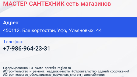 МАСТЕР САНТЕХНИК, сеть магазинов по адресу 450112, Башкортостан, Уфа, Ульяновых, 44 в дальнейшем Организация, размещена в следующих категориях:
