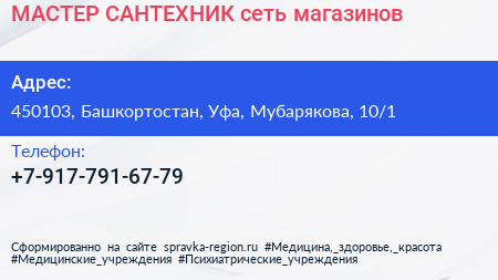 МАСТЕР САНТЕХНИК, сеть магазинов по адресу 450103, Башкортостан, Уфа, Мубарякова, 10/1 в дальнейшем Организация, размещена в следующих категориях: