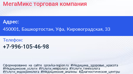 МегаМикс, торговая компания по адресу 450001, Башкортостан, Уфа, Кировоградская, 33 в дальнейшем Организация, размещена в следующих категориях:
