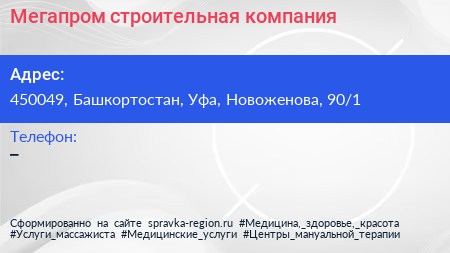Мегапром, строительная компания по адресу 450049, Башкортостан, Уфа, Новоженова, 90/1 в дальнейшем Организация, размещена в следующих категориях: