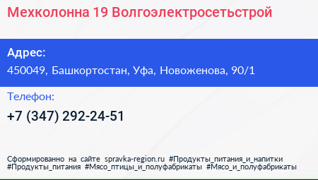 Мехколонна №19 Волгоэлектросетьстрой по адресу 450049, Башкортостан, Уфа, Новоженова, 90/1 в дальнейшем Организация, размещена в следующих категориях: