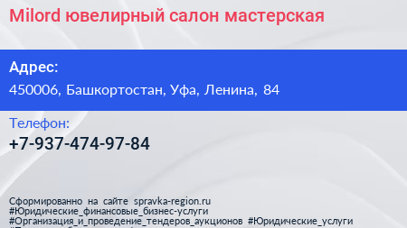 Milord, ювелирный салон-мастерская по адресу 450006, Башкортостан, Уфа, Ленина, 84 в дальнейшем Организация, размещена в следующих категориях:
