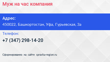 Муж на час, компания по адресу 450022, Башкортостан, Уфа, Гурьевская, 3а в дальнейшем Организация, размещена в следующих категориях: