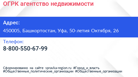 ОГРК, агентство недвижимости по адресу 450005, Башкортостан, Уфа, 50-летия Октября, 26 в дальнейшем Организация, размещена в следующих категориях: