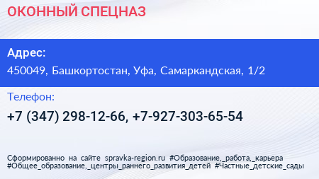 ОКОННЫЙ СПЕЦНАЗ по адресу 450049, Башкортостан, Уфа, Самаркандская, 1/2 в дальнейшем Организация, размещена в следующих категориях: