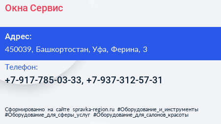 Окна Сервис по адресу 450039, Башкортостан, Уфа, Ферина, 3 в дальнейшем Организация, размещена в следующих категориях: