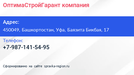 ОптимаСтройГарант, компания по адресу 450049, Башкортостан, Уфа, Баязита Бикбая, 17 в дальнейшем Организация, размещена в следующих категориях: