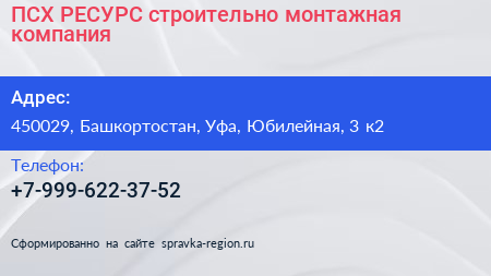 ПСХ РЕСУРС, строительно-монтажная компания по адресу 450029, Башкортостан, Уфа, Юбилейная, 3 к2 в дальнейшем Организация, размещена в следующих категориях: