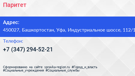 Паритет по адресу 450027, Башкортостан, Уфа, Индустриальное шоссе, 112/1 в дальнейшем Организация, размещена в следующих категориях: