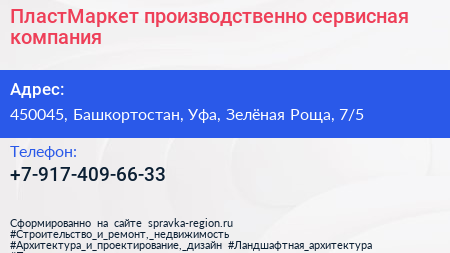 ПластМаркет, производственно-сервисная компания по адресу 450045, Башкортостан, Уфа, Зелёная Роща, 7/5 в дальнейшем Организация, размещена в следующих категориях: