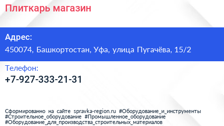 Плиткарь, магазин по адресу 450074, Башкортостан, Уфа, улица Пугачёва, 15/2 в дальнейшем Организация, размещена в следующих категориях: