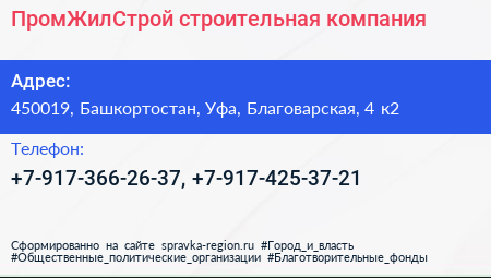 ПромЖилСтрой, строительная компания по адресу 450019, Башкортостан, Уфа, Благоварская, 4 к2 в дальнейшем Организация, размещена в следующих категориях: