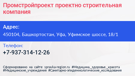 Промстройпроект, проектно-строительная компания по адресу 450104, Башкортостан, Уфа, Уфимское шоссе, 18/1 в дальнейшем Организация, размещена в следующих категориях: