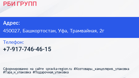 РБИ ГРУПП по адресу 450027, Башкортостан, Уфа, Трамвайная, 2г в дальнейшем Организация, размещена в следующих категориях:
