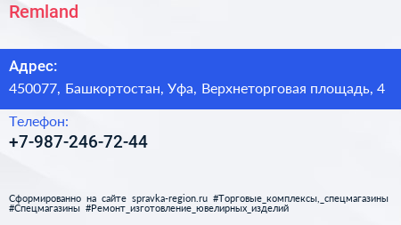 Remland по адресу 450077, Башкортостан, Уфа, Верхнеторговая площадь, 4 в дальнейшем Организация, размещена в следующих категориях: