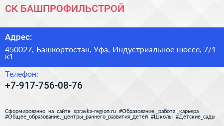СК БАШПРОФИЛЬСТРОЙ по адресу 450027, Башкортостан, Уфа, Индустриальное шоссе, 7/1 к1 в дальнейшем Организация, размещена в следующих категориях: