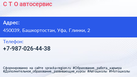 С.Т.О., автосервис по адресу 450039, Башкортостан, Уфа, Глинки, 2 в дальнейшем Организация, размещена в следующих категориях: