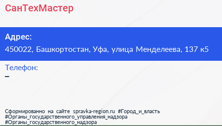 СанТехМастер по адресу 450022, Башкортостан, Уфа, улица Менделеева, 137 к5 в дальнейшем Организация, размещена в следующих категориях: