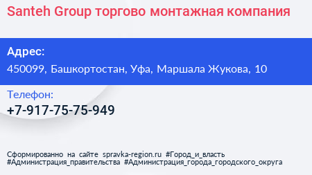 Santeh Group, торгово-монтажная компания по адресу 450099, Башкортостан, Уфа, Маршала Жукова, 10 в дальнейшем Организация, размещена в следующих категориях: