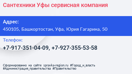 Сантехники Уфы, сервисная компания по адресу 450105, Башкортостан, Уфа, Юрия Гагарина, 50 в дальнейшем Организация, размещена в следующих категориях: