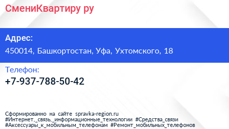 СмениКвартиру.ру по адресу 450014, Башкортостан, Уфа, Ухтомского, 18 в дальнейшем Организация, размещена в следующих категориях: