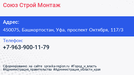Союз Строй Монтаж по адресу 450075, Башкортостан, Уфа, проспект Октября, 117/3 в дальнейшем Организация, размещена в следующих категориях: