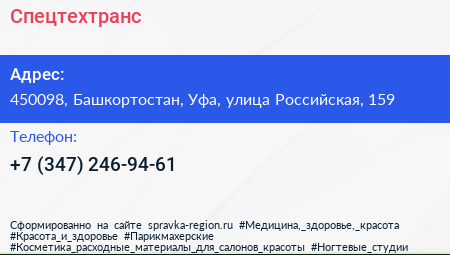 Спецтехтранс по адресу 450098, Башкортостан, Уфа, улица Российская, 159 в дальнейшем Организация, размещена в следующих категориях:
