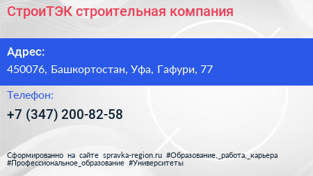 СтроиТЭК, строительная компания по адресу 450076, Башкортостан, Уфа, Гафури, 77 в дальнейшем Организация, размещена в следующих категориях: