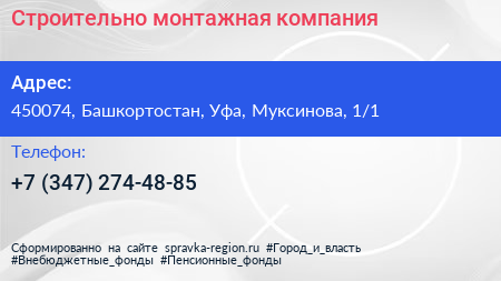 Строительно-монтажная компания по адресу 450074, Башкортостан, Уфа, Муксинова, 1/1 в дальнейшем Организация, размещена в следующих категориях: