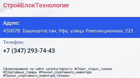 СтройБлокТехнология по адресу 450078, Башкортостан, Уфа, улица Революционная, 221 в дальнейшем Организация, размещена в следующих категориях: