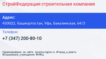 СтройФедерация, строительная компания по адресу 450022, Башкортостан, Уфа, Бакалинская, 64/3 в дальнейшем Организация, размещена в следующих категориях: