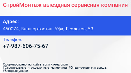 СтройМонтаж, выездная сервисная компания по адресу 450074, Башкортостан, Уфа, Геологов, 53 в дальнейшем Организация, размещена в следующих категориях: