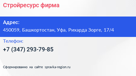 Стройресурс, фирма по адресу 450059, Башкортостан, Уфа, Рихарда Зорге, 17/4 в дальнейшем Организация, размещена в следующих категориях: