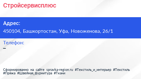 Стройсервисплюс по адресу 450104, Башкортостан, Уфа, Новоженова, 26/1 в дальнейшем Организация, размещена в следующих категориях: