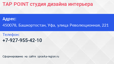 TAP POINT, студия дизайна интерьера по адресу 450078, Башкортостан, Уфа, улица Революционная, 221 в дальнейшем Организация, размещена в следующих категориях:
