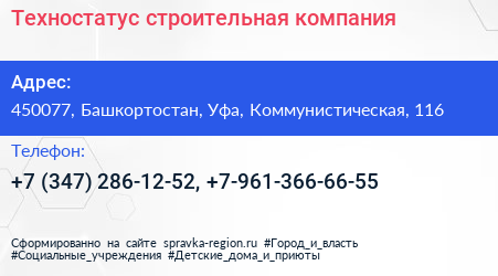 Техностатус, строительная компания по адресу 450077, Башкортостан, Уфа, Коммунистическая, 116 в дальнейшем Организация, размещена в следующих категориях: