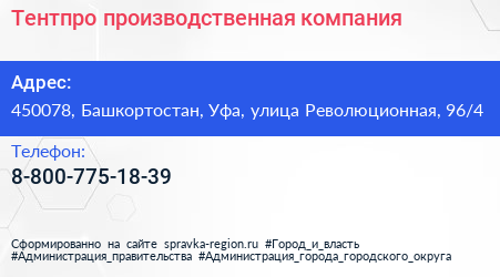 Тентпро, производственная компания по адресу 450078, Башкортостан, Уфа, улица Революционная, 96/4 в дальнейшем Организация, размещена в следующих категориях: