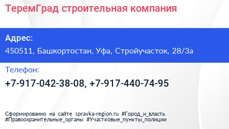 ТеремГрад, строительная компания по адресу 450511, Башкортостан, Уфа, Стройучасток, 28/3а в дальнейшем Организация, размещена в следующих категориях: