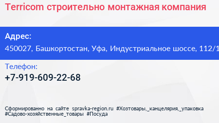 Terricom, строительно-монтажная компания по адресу 450027, Башкортостан, Уфа, Индустриальное шоссе, 112/1 в дальнейшем Организация, размещена в следующих категориях: